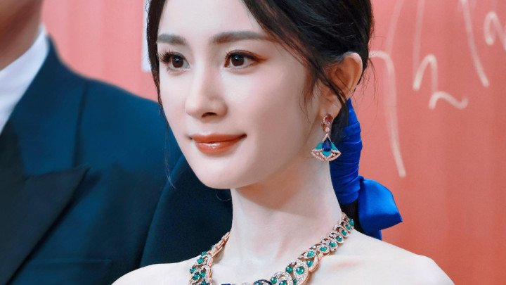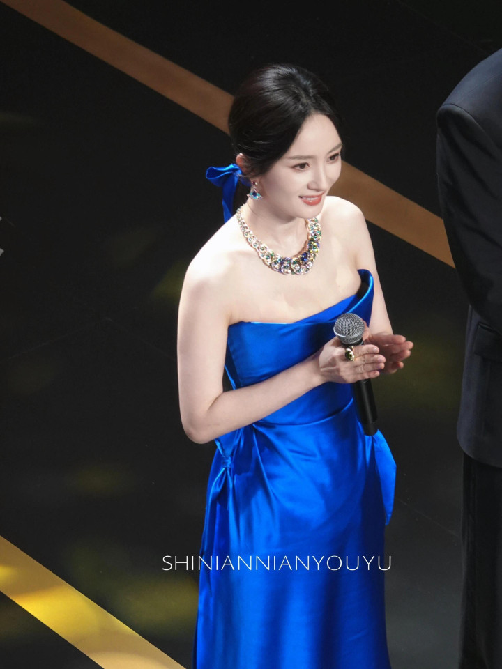 杨幂身着蓝色抹胸礼服,佩戴华丽珠宝,手持圆筒物件,肌肤光洁,眼神明亮自信,五官精致,尽显优雅高贵气质。