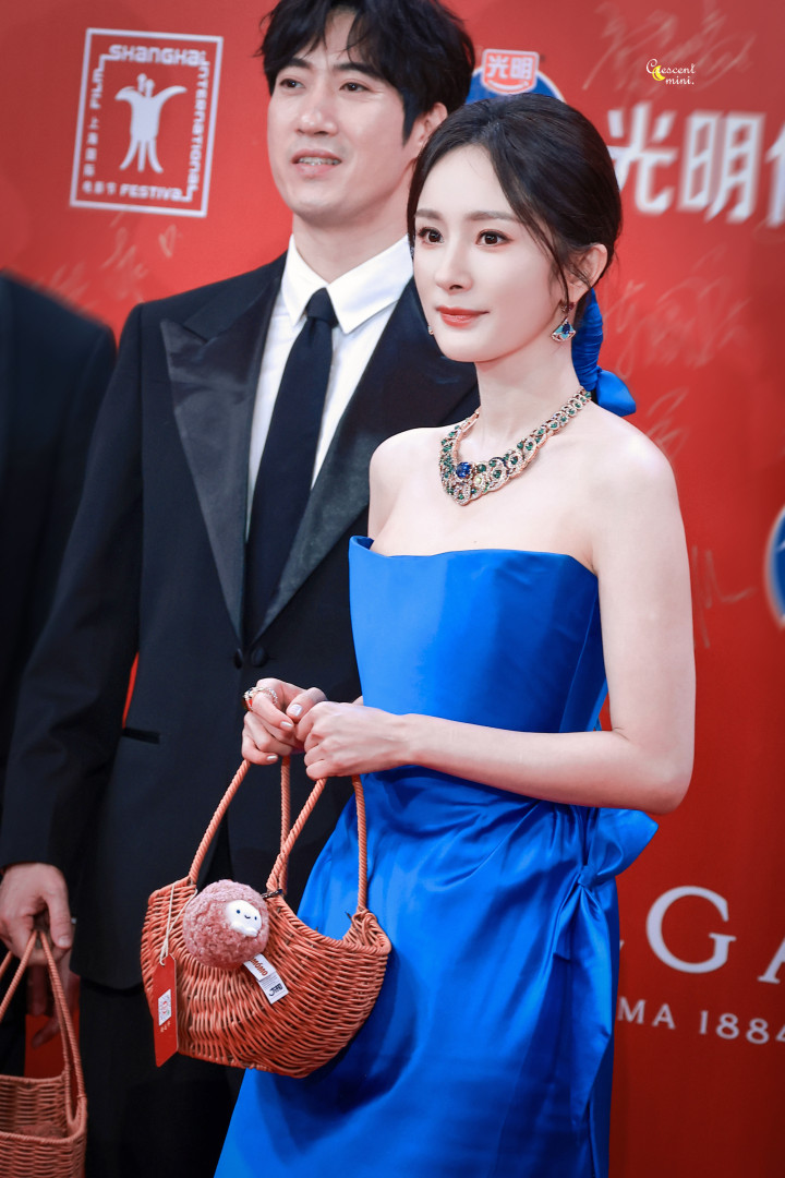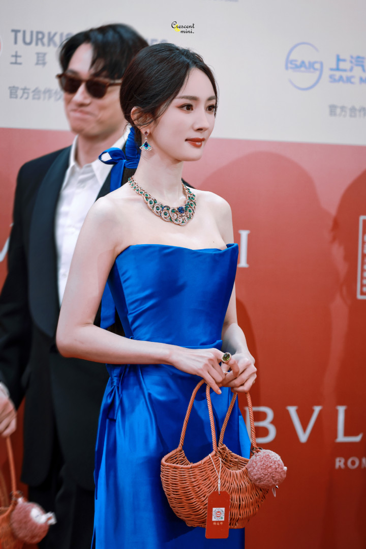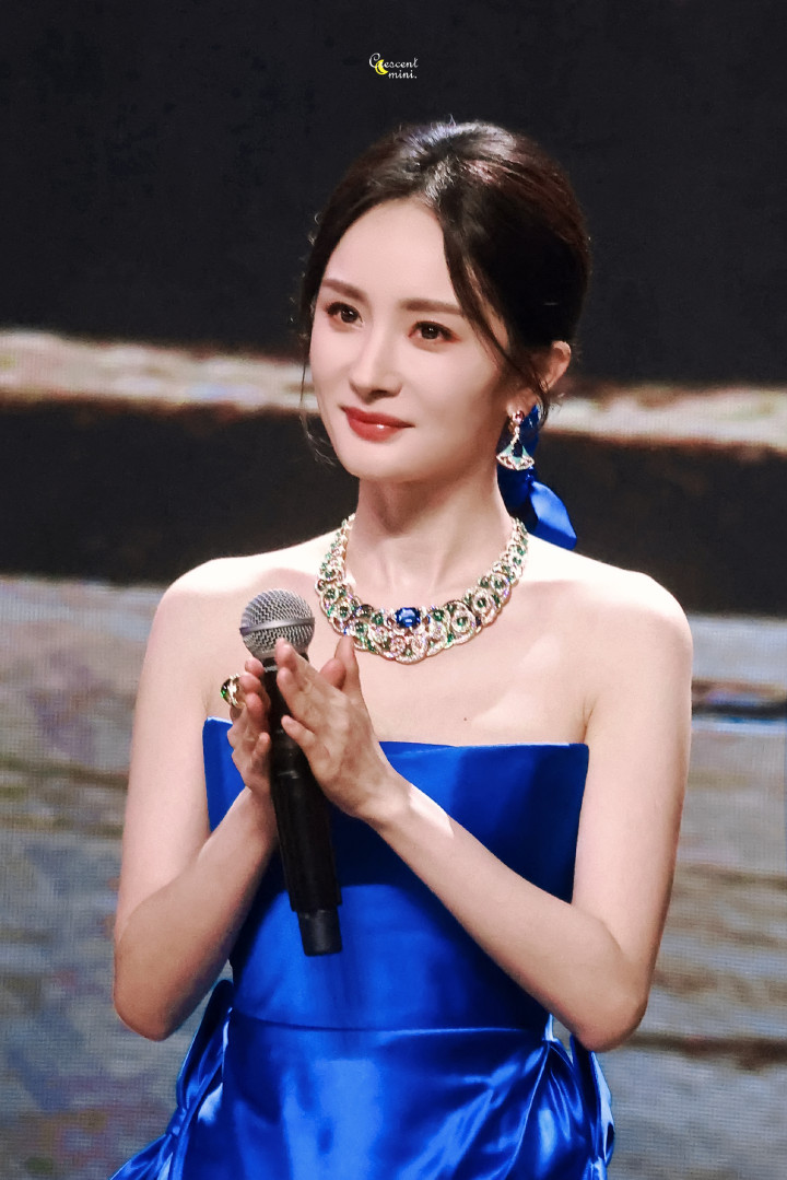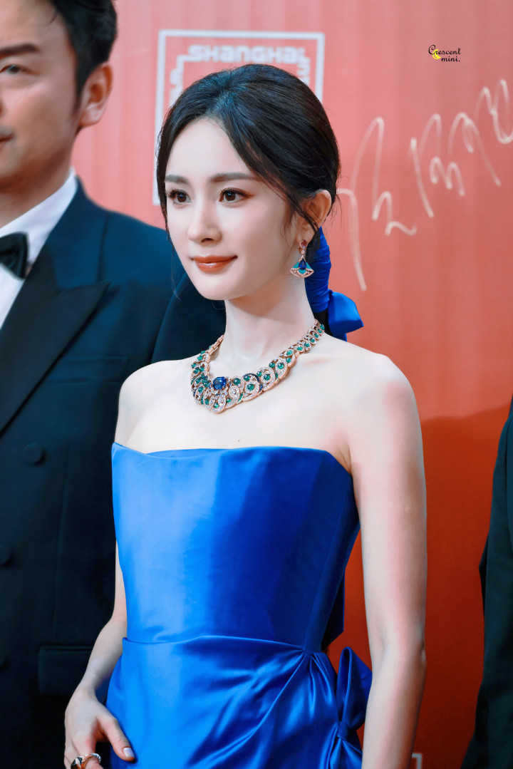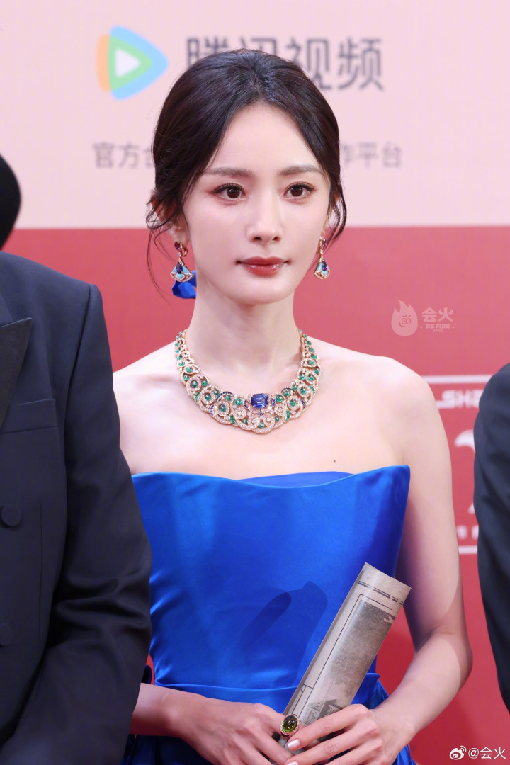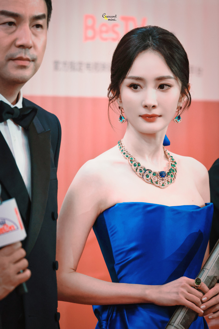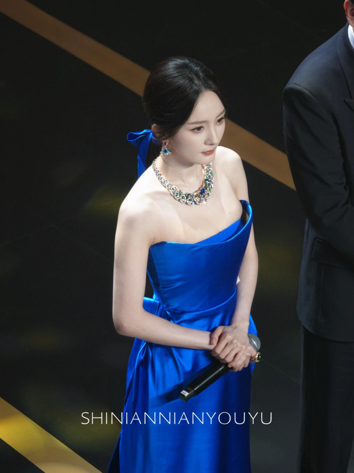 杨幂一袭蓝色抹胸礼服, 白皙香肩迷人吸睛, 精致五官红唇诱人!